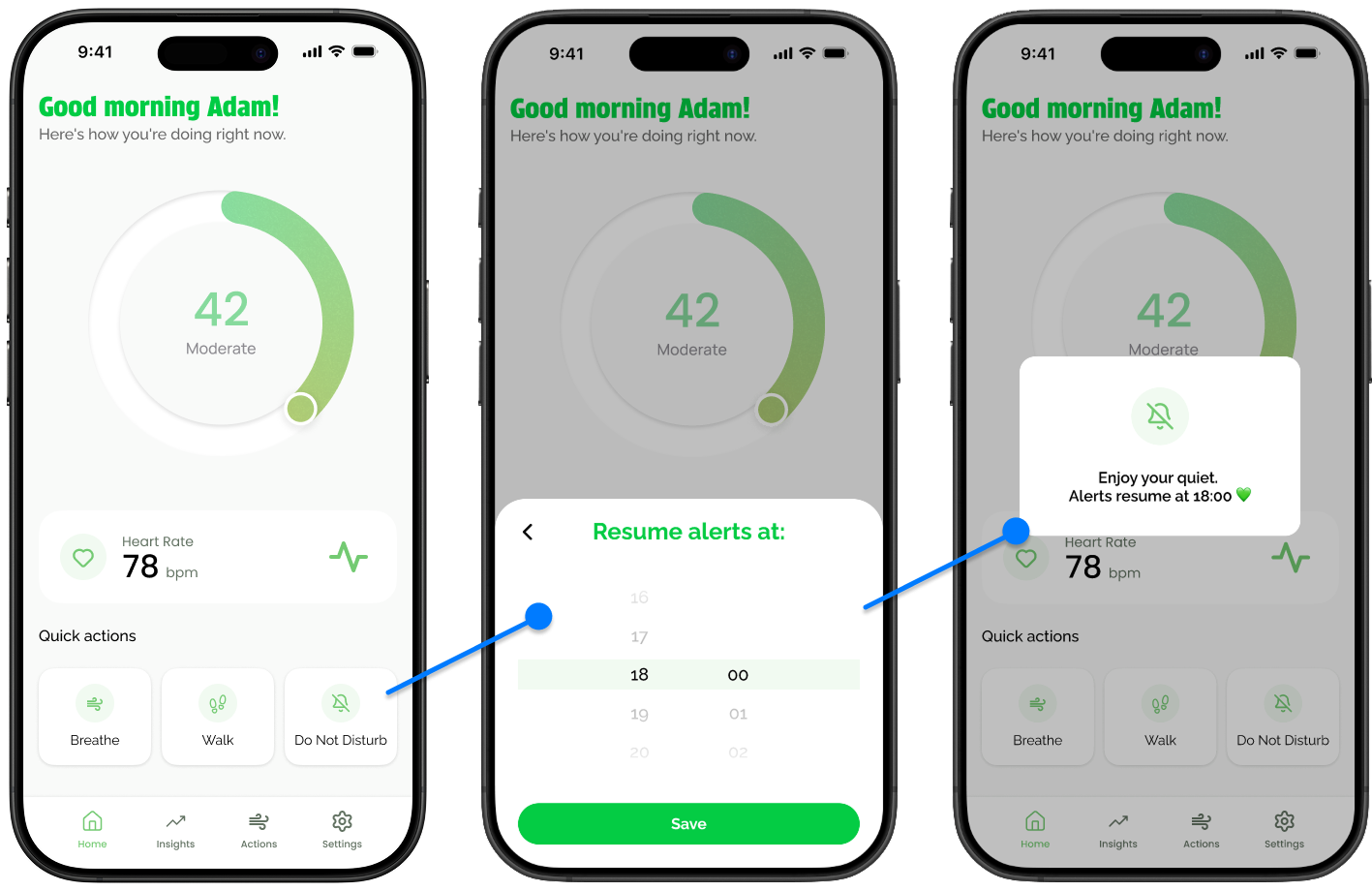 Since users didn’t have issues with performing Actions, I focused the solution ideas on making the Do Not Disturb button easier to find and creating a pop up to determine the breathing exercise’s length.